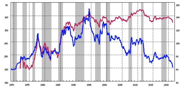 最後に、内外の物価格差を考慮した円の実質的な価値である実質実効為替レートの推移を確認しよう。70代以降、貿易黒字の大幅な拡大(円高要因)やプラザ合意によるドル高是正、そして日米貿易摩擦問題の深刻化などで、円の価値は上昇していった。