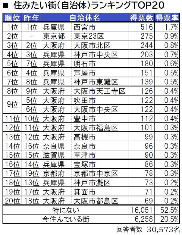 22年の「住みたい街(自治体)ランキング」は、昨年は関西圏の自治体のみを対象として集計したが、今年は全国の自治体を対象とした。1位は昨年と同様、兵庫県の西宮市が選ばれた。2位は関東圏で唯一ランクインした東京23区、3位は昨年2位の大阪市北区だった。