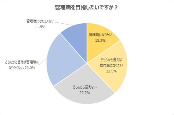 管理職を目指したいか問うと「管理職になりたくない」が11.5%、「どちらかと言えば管理職になりたくない」が23.0%と、合わせて34.5%が管理職になりたいと考えていなかった。