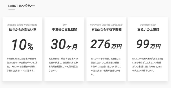 初期の費用支払いなし、いわゆる「出世払い」でエンジニアとなるためのカリキュラムを受講できるサービスがある。LABOT(東京都渋谷区)が運営する「CODEGYM(コードジム)」だ。初期費用のかからない「ISA」という支払い方法を使い、転職が成功したあとに、月額額面の10%を30カ月に渡って支払うという仕組み。