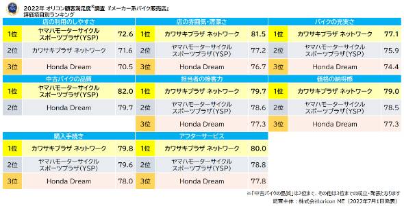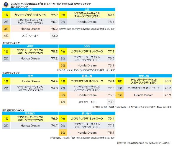 バイクの区分別では「原付(排気量が0〜50ccのバイク)」で「Honda Dream」、「普通二輪(排気量が51〜400ccのバイク)」で「カワサキプラザ ネットワーク」、「大型二輪(排気量が400ccを超えるバイク)」で「ヤマハモーターサイクルスポーツプラザ(YSP)」がそれぞれ1位となっている。車種によって特徴が表れる結果となった。