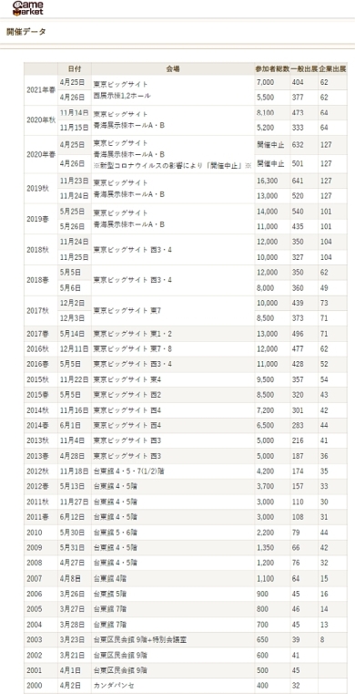 売り上げ規模とは別に、ユーザー規模の推移を示す指標として「ゲームマーケット」の参加者数があります。公式Webサイトに公開されている数字を見ると、2000年の第1回からコロナ前の19年まで、ほぼ毎回10ポイント以上のペースで増えていました。
