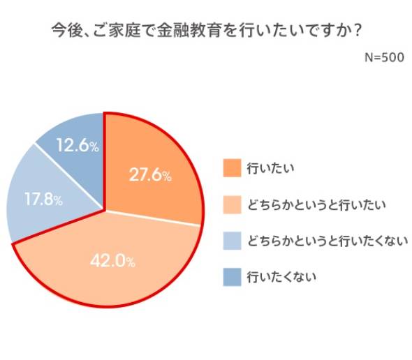 今後、家庭で自身の子どもに金融教育を行いたいかの問いに、「行いたい」と答えた割合は27.6%、「どちらかというと行いたい」が42.0%と、合わせて約7割が子どもに金融教育を行いたいと回答した。親自身が子どもの頃を振り返って金融教育を受けたかったと感じているように、自身の子どもには早いうちから金融に関する知識をつけてほしいと願う親が多いことが伺える結果となった。