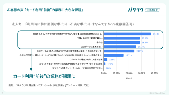 「事前申請が漏れる。サブスクリプション系サービスの利用が勝手に更新されてしまう。誰が何のために使ったのか分からない」「従業員にカードを配ったが、利用の事前申請が上がらない。経費精算できないものを決済してしまうケースが多発した」など、バクラク ビジネスカードの開発にあたったLayerXの秋田康男プロダクトマネージャーは企業の実態をこう説明する。