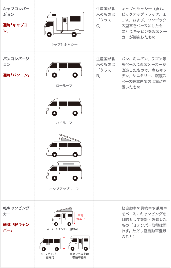 「バンコン」とは、「ハイエース」などの1BOXのバンをベースに製作されたキャンピングカーで、正式には「バンコンバージョン」と呼びます。「キャブコン」とは「キャブコンバージョン」の略で、キャブ(キャビン)=運転席がある小型トラックなどのシャシーに、客室を架装したものを指します。一般的に「バンコン」よりも、「キャブコン」の方が大きな室内空間を確保できます。そして「軽キャンパー」は、軽自動車をベースにしたキャンピングカーです。軽キャンパーのうち、8ナンバー登録は全体の3.6%、それ以外が13.5%で、8ナンバー以外が主流となります。