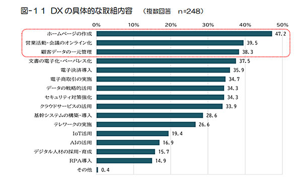 ところが、具体的に何をすればDXなのかというと、取組内容をみても、「ホームページの作成」「営業活動・会議のオンライン化」「顧客管理データの一元管理」が上位となっており、DXに向けたIT化・デジタル化の途上といった状況が伺える。
