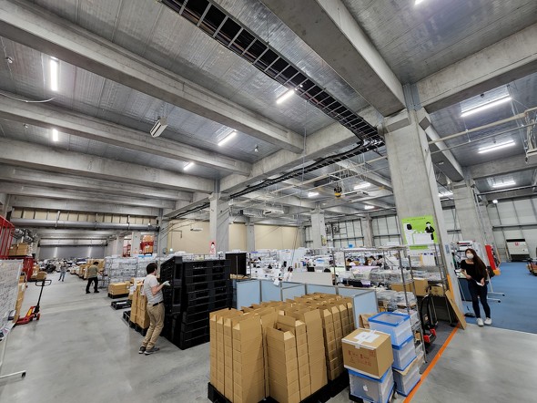 「にこスマ」の三つ星スマホを支えているのが神奈川県座間市にある、国内最大級の中古スマホ検査センターだ。約5000平米という広い敷地に、通信キャリア、法人、個人、さらに海外拠点から回収、調達された端末が集まり、検査、復元できない状態までのデータ消去、写真撮影、配送まで、すべての工程がこの検査センターで行われている。