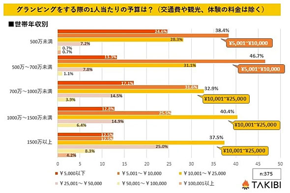 世帯年収別に見ても、観光や体験にかける予算は「5001〜1万円」が最も多かったが、グランピング施設でかける予算に違いはあるのだろうか。
