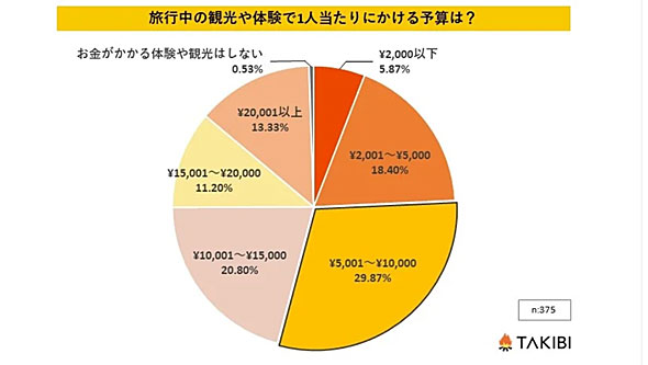 次いで「1万1〜1万5001円」(20.80%)、「2001〜5000円」(18.40%)、「2万1円以上」(13.33)と続いた。「お金がかかる観光や体験はしない」と答えたのは、わずか0.53%にとどまった。