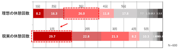 理想の休憩回数で最も多いのは「3回」(26.0%)だが、実際の休憩回数の最多は「1回」(29.7%)だった。1回当たりの理想の休憩時間は「15分未満」(59.8%)が最も多く、実際の休憩時間の最多である「10分未満」(66.1%)とは大きなギャップがあることが判明した。