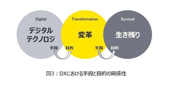 生き残るために競争優位性を獲得することがDXの主目的であり、”変革”はその手段にすぎないのだ。手段と目的は連綿とつながる関係にあるものの、その位置関係を見誤らないことが重要である(図3)。
