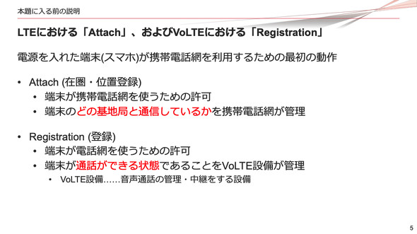 LTEにおけるAttachは「在圏確認」や「位置登録」と呼ばれることもある、端末が携帯電話ネットワークを使うための許可を取る動作だ。これによって端末がどの基地局と通信しているかを管理する。Registrationは音声通話の電話網を使うための許可を取る動作だ。Registrationによって、VoLTEに関する設備が、端末が電話できる状態であるかどうかを管理する。Registrationが済むと、端末から電話をかけたり、ほかの端末からの電話を受けたりすることができるようになる。