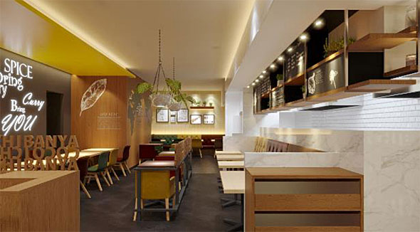 海外では店ごとに異なるデザインを採用していて、「非日常の空間を演出するために、店舗の内外装にこだわっている」(同社)。京橋エドグラン店でも海外流のデザインを取り入れ、内装はスパイスカラーをベースに、明るい色のタイルや墨色の床材などでまとめている。また、店名には「WORLD」の文字を加え、ほかのココイチとは異なる店舗であることを示している。