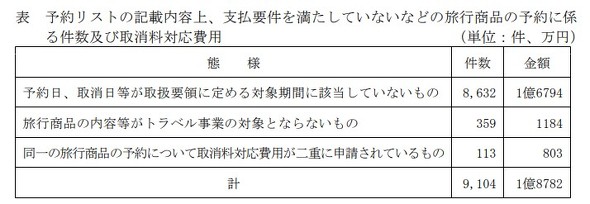“二重チェック”も行っていた。観光庁は事務局に対し、事前審査を終えた申請について、あらためて審査する「事後審査」を指示。これを受け、事務局は21年5〜8月の期間で、申請予約件数の多い「年末年始の全国に係る旅行」と「緊急事態宣言に伴う全国に係る旅行」の約358万件から事後審査の対象を無作為に抽出。その中で申請内容に疑義があった旅行事業者などの申請6086件を対象に審査を実施。その結果、502件でキャンセル対応費用の二重申請や、そもそも要領に定める期間に該当していなかったことが発覚し、観光庁に報告していた。