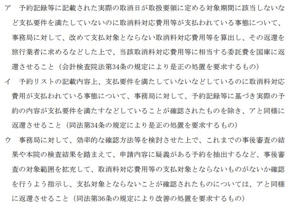 今回の結果を受け、会計検査院は観光庁に対して是正ならびに改善処置を要求。旅行事業者に対して、要件を満たしていないのに支払いがあった金額分の返還を求めることなどを求めている。