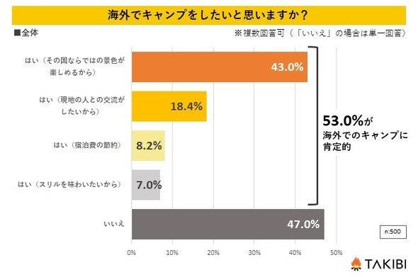最初に、「海外でキャンプをしたいと思うか」と尋ねたところ、53.0%が「はい」と回答した。理由は多い順に「その国ならではの景色が楽しめるから」(43.0%)、「現地の人との交流がしたいから」(18.4%)、「宿泊費の節約」(8.2%)――という結果になった。