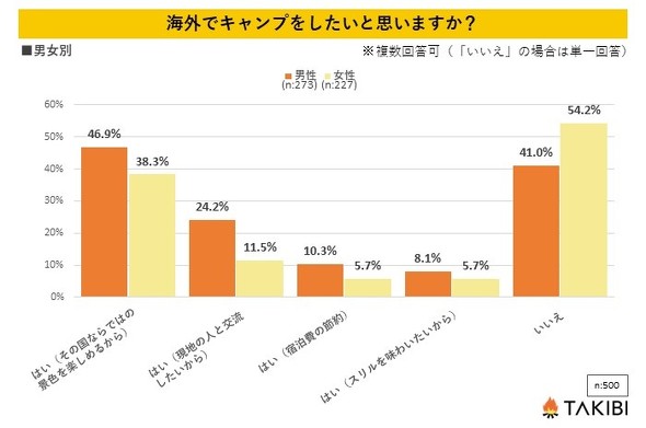 男女別で見ると、海外でキャンプをしたいと考える女性の割合が45.8%であるのに対し、男性は59.0%となり、男性の方が前向きであることがうかがえる。