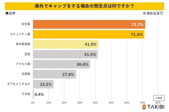 海外でキャンプをしたいと回答した人に「海外でキャンプをする際の懸念点」を尋ねたところ、一番多かったのは、「安全面」で71.7%、次いで「セキュリティ面」で71.3%となった。