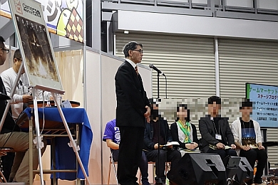 ゲームマーケット大賞授賞式で講評を述べる審査員長の草場純氏。ゲームデザイナーの創作意欲喚起と社会的認知の向上を目指して創設されたゲームマーケット大賞は一定の成果を果たしたとして2019年度に終了した(画像提供:ゲームマーケット事務局)