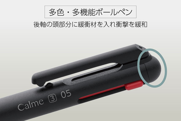 単色はカム機構を採用。ノック部に回転子と摺動子(しゅうどうし:滑らせて動かすこと)が組み込まれており、ノックすると回転子が回転運動、摺動子が上下運動をする。このとき、摺動子が回転子の回転運動に伴う衝撃を緩和。最後まで指を添えてノックすれば、芯が静かに出てきてくれる。一方、多色・多機能は、後軸の頭の内側にメチルゴム製の緩衝材を入れることでノック音を小さくした。
