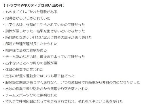 「体育の授業中に笑われた」「チーム決めなどの時、最後まで余っていて嫌だった」「持久走で呼吸困難になっても走らされ笑われ、それをネタにいじめを受けた」――。