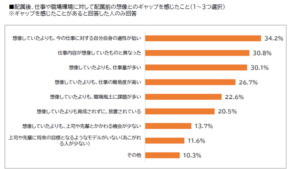 「配属後、仕事や職場環境に対して配属前の想像とのネガティブな意味でのギャップを感じたことがあるか」については、25%の新入社員が「ある」と回答した。最も多い理由は「想像していたよりも、今の仕事に対する自分自身の適性が低い」(34.2%)で、「仕事内容が想像していたものと異なった」(30.8%)、「想像していたよりも、仕事量が多い」(30.1%)と続いた。