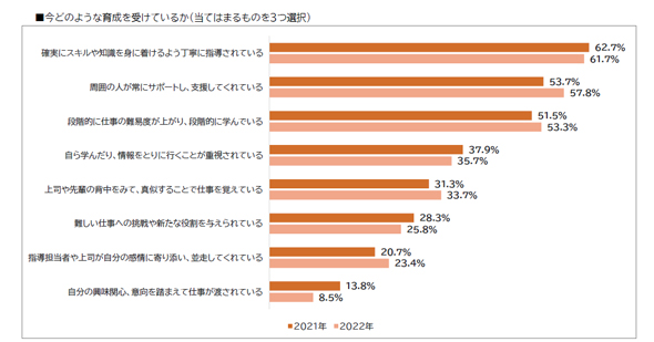 新入社員の育成内容は、「自分の興味関心、意向を踏まえて仕事が渡されている」を除いて21年の数値と比較した際の増減は5%で、21年から22年の1年間で職場の育成環境は大きく変わっていないことが分かった。