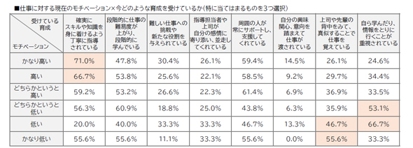 育成とモチベーションの相関については、「確実にスキルや知識を身に着けるよう丁寧に指導されている」と感じている新入社員は、モチベーションが高い傾向にあった。一方、「上司や先輩の背中を見て、真似することで仕事を覚えている」「自ら学んだり、情報をとりに行くことが重視されている」と感じている新入社員は、モチベーションが低い傾向にあることが分かった。