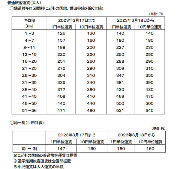 東急電鉄は、3月18日に値上げを実施する。初乗り運賃が交通系ICカードで126円のところ、140円に。最長距離の51キロから56キロまでは、471円から531円に。均一運賃の世田谷線は147円から160円になる。