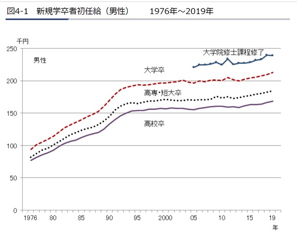 わが国における長期の景気低迷を指して俗に「失われた30年」などといわれるが、労働政策研究・研修機構の統計結果からも分かる通り、新卒初任給の水準はこの30年でほとんど増加していない。その間、その間、「いざなみ景気」と名付けられた、「いざなぎ景気」を上回る長期の景気拡大期(02年2月〜08年2月の73カ月間)を含む複数の好景気が存在したにもかかわらず、だ。