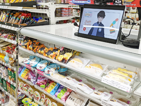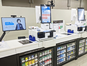 セルフレジの横に設置されたモニターでは、オペレーターが客の操作画面を確認しながら声掛けをしてくれる。この店ではたばこやお酒もセルフレジで購入できるため、運転免許証の読み込みによる年齢確認といった少し複雑な操作も、アバター接客でサポートする(店舗スタッフが対面で年齢確認する方法も選択可能)。