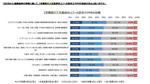 ISO30414国際標準基準と「求職者への入社意欲向上」および「従業員のエンゲージメント」の関係について調査すると、「効果がある」という回答が否定的な回答より多い結果となった。この点について荒木研究員は「求職者に関しては適切な情報開示によって健全な経営姿勢を示すことで企業への信頼感を高めようとしているのではないか。また、従業員に対しても信頼感の醸成という側面は同様で、より長く働き続けてもらうためには、人的資本情報の透明化が重要だと考えていると推測される」とコメントした。