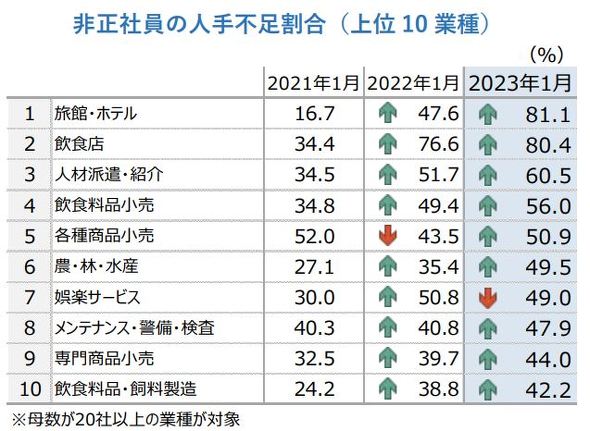 帝国データバンクが23年1月、全国1万社超に対して実施した「人手不足に対する企業の動向調査」によると、「正社員の人手が足りない」と回答した飲食店は60%超。アルバイトなど「非正規社員の人手が足りない」との回答はなんと80%を超え、コロナ禍前のインバウンド需要が活況だった19年以前と比べても過去最高に人手が不足している状況だ。