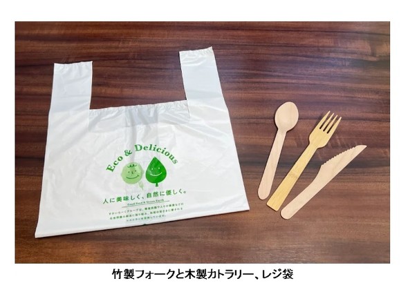 すかいらーくグループではレジ袋とカトラリー(フォークなど)を1月12日から有料化しています。また、脱プラを推進するため木製フォークを採用していましたが、耐久性向上を目的に竹製フォークへの変更を進めています。おすすめメニューだけでなく、こうした取り組みをテーブル上にあるタブレットの動画で解説しています。