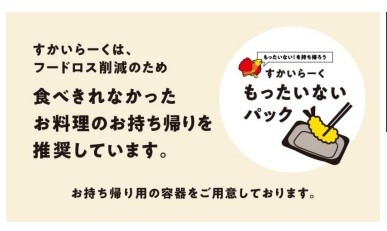 また、フードロス削減のため、食べきれなかった料理の持ち帰りを推奨しています。具体的には「もったいないパック」を20円で提供しています。