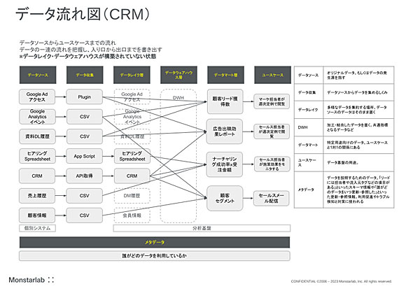 流れ図は前回の連載で紹介した「分析ユースケース」を先に考え、最下流にデータを受け止める形で配置します。今あるデータから考えてしまうと、焦点のぶれたレポート出力など、本当にほしい分析のためのデータ基盤から遠ざかってしまいます。分析ユースケースの実現に向けて、データ不足の問題や質の問題がある場合、それを改善するタスクを計画・実行していく手順がよいでしょう。