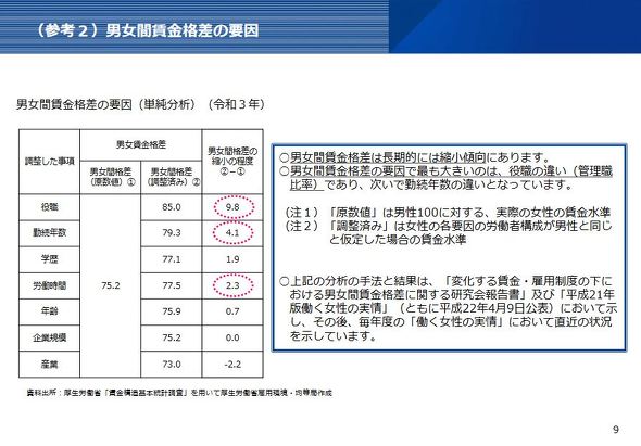 厚生労働省は、男女の賃金格差が解消されない最大の要因として「役職の違い(管理職比率)」を挙げており、次いで「勤続年数の違い」となっています。