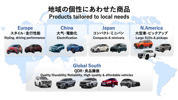 「幸せの量産と言われてもどうも腑に落ちない」人もいるだろう。そこを説明したのが図2だ。トヨタは世界各地域でクルマを販売するグローバル企業であり、地域によって求められるクルマも技術も異なる。これまでトヨタが何度も説明してきたマルチソリューションとは、「幸せの量産」のために、多様な地域の人々の暮らしそれぞれに合わせた最適な答えを複数用意することであり、それら複数のクルマを最速かつ合理的に生産するために共通基盤技術であるTNGA(トヨタ・ニュー・グローバル・アーキテクチャー)を採用していくことになる。