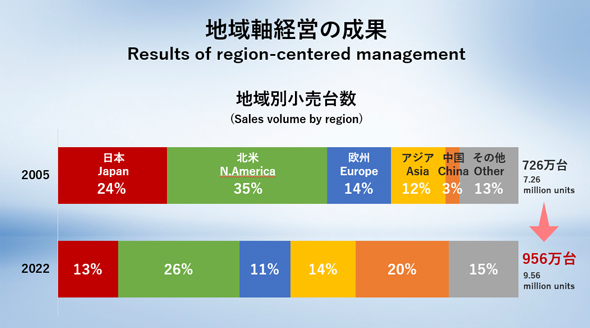 TNGAの採用によって、各地域で具体的にどのように顧客の支持を得られるようになったのかを表したのが図3である。2005年比で小売台数総合計を32%増やしながら、地域ごとのシェア比を均等に近づけている。乱暴に言えば日米がメインの会社から、アジアや中国でもマーケットの取れる会社へと転換を図っているということになる。