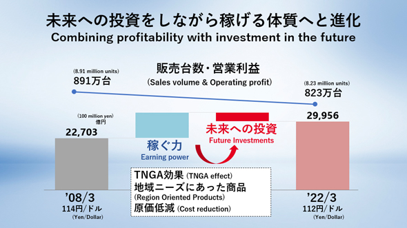 もちろん、そうやって多様な地域のニーズに応える商品をつくることで、コスト的に厳しくなっては意味がない。そこを説明するのが図4である。左のリーマンショックの08年と部品不足で生産が思うようにいかなかった22年を比べると、22年は08年比で台数を8%落としながら、営業利益を32%増やしている。そんなことができているのは「TNGAをはじめとする原価低減」の効果であり、それによって得られたものは「稼ぐ力」と「未来への投資力」である。