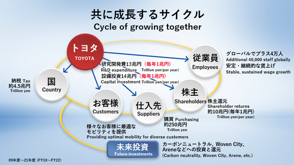 という話になると必ず出てくるのが「トヨタばっかりもうけやがって」という陰口なのだが、挙げた利益を「国・お客様・仕入れ先・株主・従業員」にどのように分配してきたかを示すのが図5で、多くに具体的な金額が入っている。まあこれだけのエビデンスを出しても文句を言う人はなくならないとは思うが、数字ベースで見るとこういうことだ。図のタイトルにトヨタの主張が込められている。