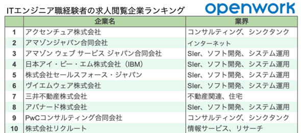 求人閲覧数が多い企業ランキング ITエンジニアと営業職の1位は?:オープンワーク調べ(2/2 ページ)