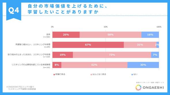 「自分の市場価値を上げるために、学習したいことがあるか」を聞いた。「明確にある」(26%)と「何となくある」(58%)と回答した人を合わせると、全体の84%(301人)を占めた。
