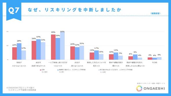 「再度取り組みたい、リスキリング中断者」と「取り組みが止まったままの、リスキリング中断者」は、なぜリスキリングを中断したのか。最も多かった理由は「一人で勉強し続けるのがつらかったから」(45%、87人)で、次いで「成長を実感できなかったから」(34%、66人)、「お金が足りなくなったから」(24%、46人)となった。