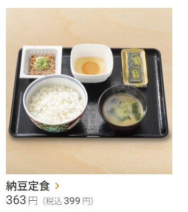 300円台の朝食メニューには、松屋の「牛小鉢朝定食」(380円)、すき家の「自社製ベーコンエッグ朝食」(390円)、吉野家の「納豆定食」(399円)などがある。