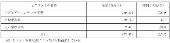 売上高(とセグメント利益)はメディア・コンテンツ事業2392億3700万円(44億6600万円)、不動産事業307億5900万円(50億7500万円)、その他の事業24億7600万円(-1億5700万円)。