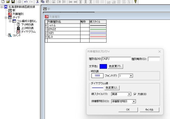 次は列車名と表示色の設定だ。東京〜札幌間は「はやぶさ」とし、色はE5系にちなんでミドリ。函館〜札幌間は在来線の「北斗」を継承する。東京〜函館間は「ひばり」とした。色はブルー。鳥の名前にしようと函館市の鳥を調べたら「やまがら」だった。これは「やまびこ」と紛らわしい。そこで往年の東北本線の特急「ひばり」の名を復活させる。ひばりは上野〜仙台間の列車だった。走行区間としては上野〜青森間の「はつかり」のほうが近いけれど、これも「はやぶさ」に間違われそうだ。