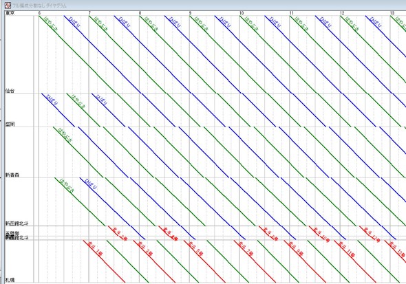 今回は速度の差はないから、まず「東京〜札幌」「東京〜函館」をそれぞれ1時間おき、30分ずらして交互に設定した。これは現在の東京〜大宮間の新函館北斗行き、新青森行きダイヤに準ずる。上越、北陸新幹線も走る区間だから、現状の運行本数を維持する。OuDiaは各駅停車の列車を入力すると駅間の最短所要時間を記憶する。列車をコピーして始発駅の時刻を入力すると、終点までの時刻を自動的に設定してくれる。だからすべての駅の時刻を入力する必要はない。