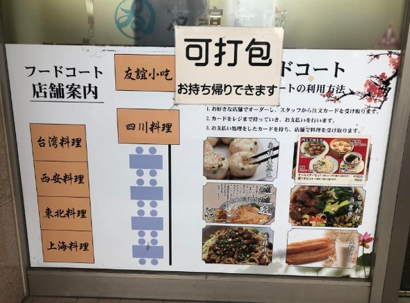 店舗は6店あって、四川料理、上海料理、台湾料理、飲茶、豆乳と朝食などの専門店が入居していて、屋台のようでもある。同じフロアには、中国食材店の「友誼商店」が併設されており、東京在住の中国人にとって貴重な郷里の食材調達の場となっている。