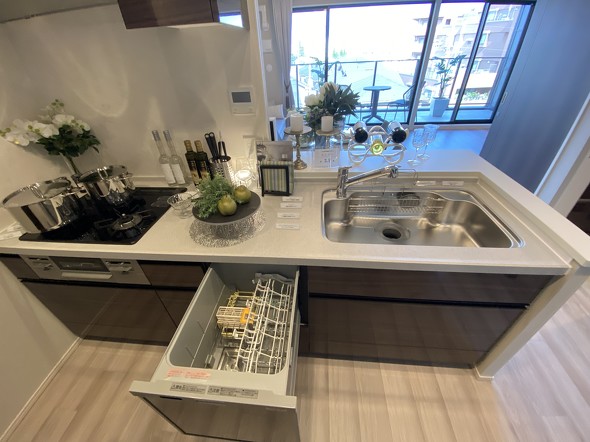 現在、首都圏では60平米台前半の3LDKが出ているなか、67平米の3LDKが中心となり、LDの床暖房はもちろんキッチンにはディスポーザー(生ゴミ粉砕処理機)と食器洗い乾燥機が標準設置される。キッチンのスライド収納にはソフトクロージング機能が備えられ、浴室にはミストサウナまで付く。